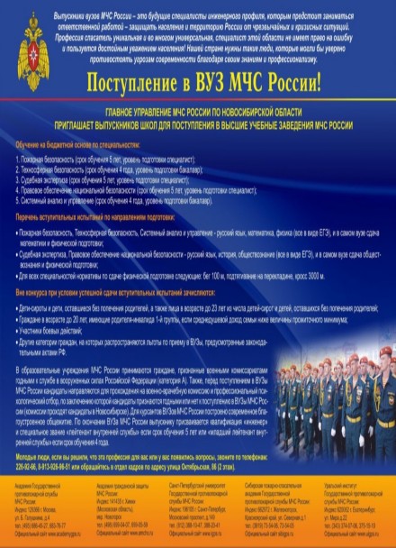 Главное управление МЧС России по Новосибирской области области информирует о наборе кандидатов на обучение в ВУЗах МЧС России в 2019году.